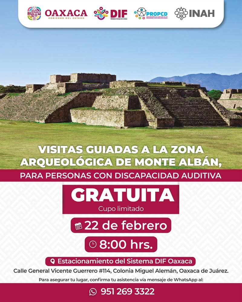 Oaxaca de Juárez, Oax., 20 de febrero de 2026.- El Sistema para el Desarrollo Integral de la Familia (DIF) Oaxaca invita a personas con discapacidad auditiva a una visita guiada a la Zona Arqueológica de Monte Albán, este domingo 22 de febrero, como parte de la campaña “La inclusión te incluye”.