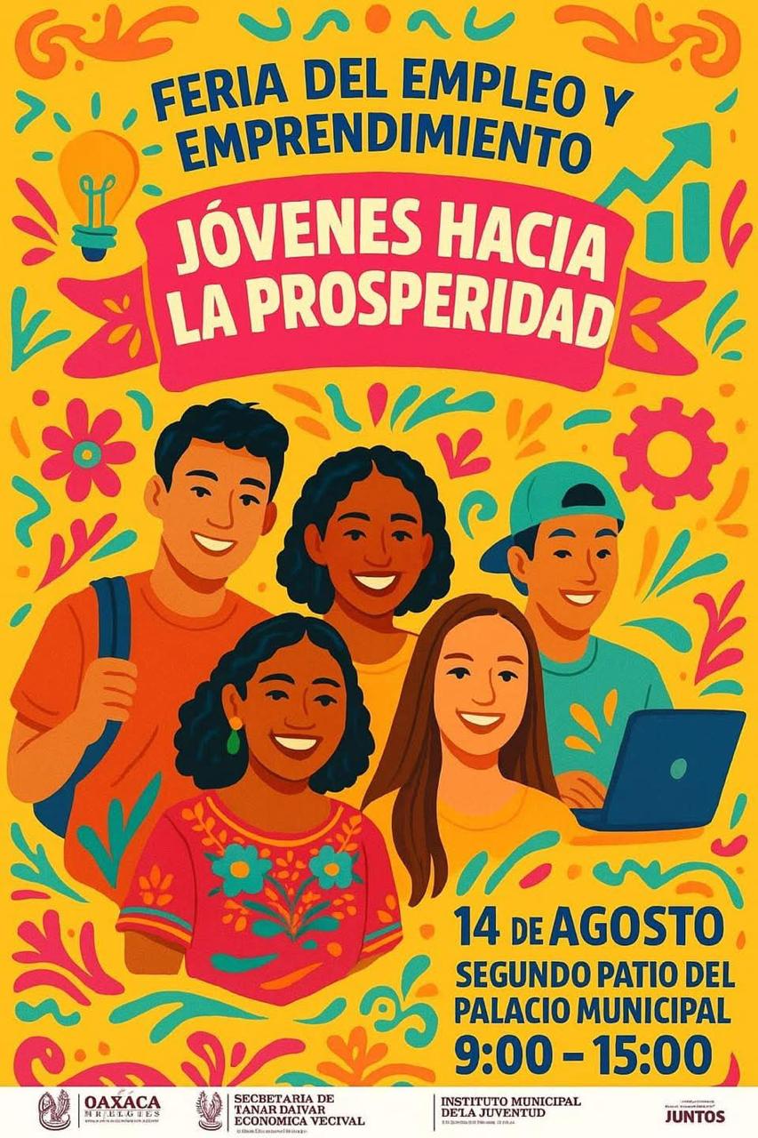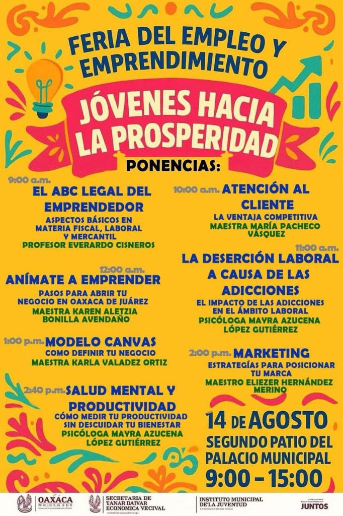 Oaxaca de Juárez, Oax., 12 de agosto de 2025.– Con el objetivo de acercar oportunidades laborales, fortalecer las capacidades de emprendimiento y promover el desarrollo económico de la capital, el Municipio de Oaxaca de Juárez, a través de la Secretaría de Prosperidad Económica Vecinal y el Instituto Municipal de la Juventud, realizará la Feria del Empleo y Emprendimiento “Jóvenes hacia la Prosperidad” este 14 de agosto, en el segundo patio del Palacio Municipal, de 9:00 a 15:00 horas.