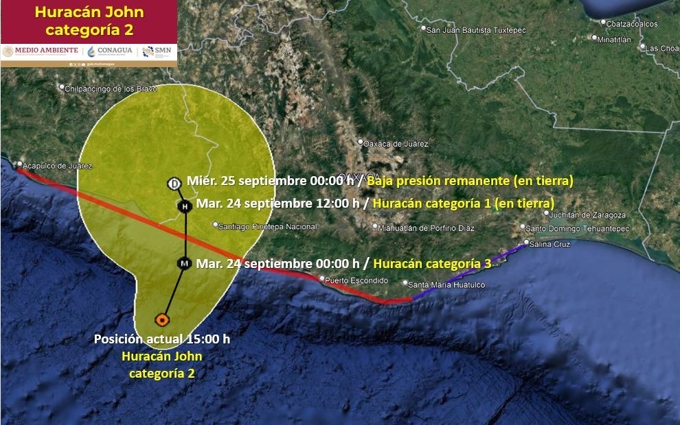 El reporte del organismo establece que, de mantener la trayectoria actual, se prevé que el centro del huracán “John” toque tierra entre Santiago Pinotepa Nacional, Oaxaca y Copala, Guerrero, entre las 21 horas de este lunes 23 de septiembre y a las 01 horas del martes 24.