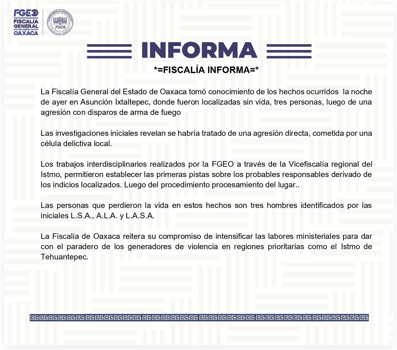 Las personas que perdieron la vida en estos hechos son tres hombres identificados por las iniciales L.S.A., A.L.A. y L.A.S.A.