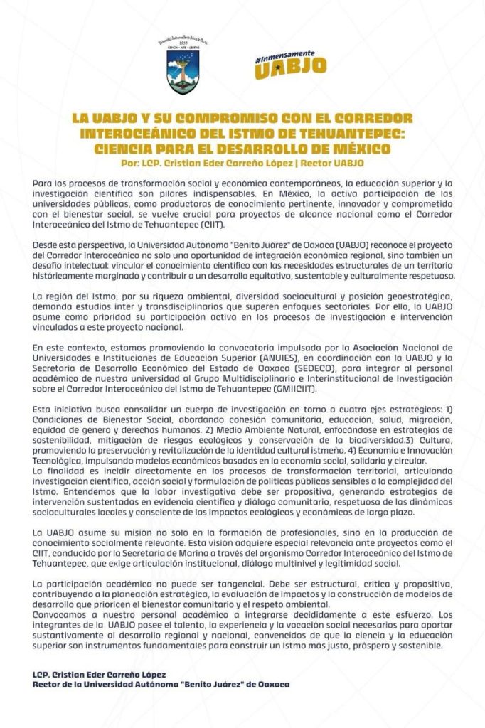 El texto destaca el papel de la UABJO en la transformación social y económica de México a través de su participación activa en el Corredor Interoceánico del Istmo de Tehuantepec (CIIT). La universidad asume un rol crucial al vincular el conocimiento científico con las necesidades estructurales de una región históricamente marginada.