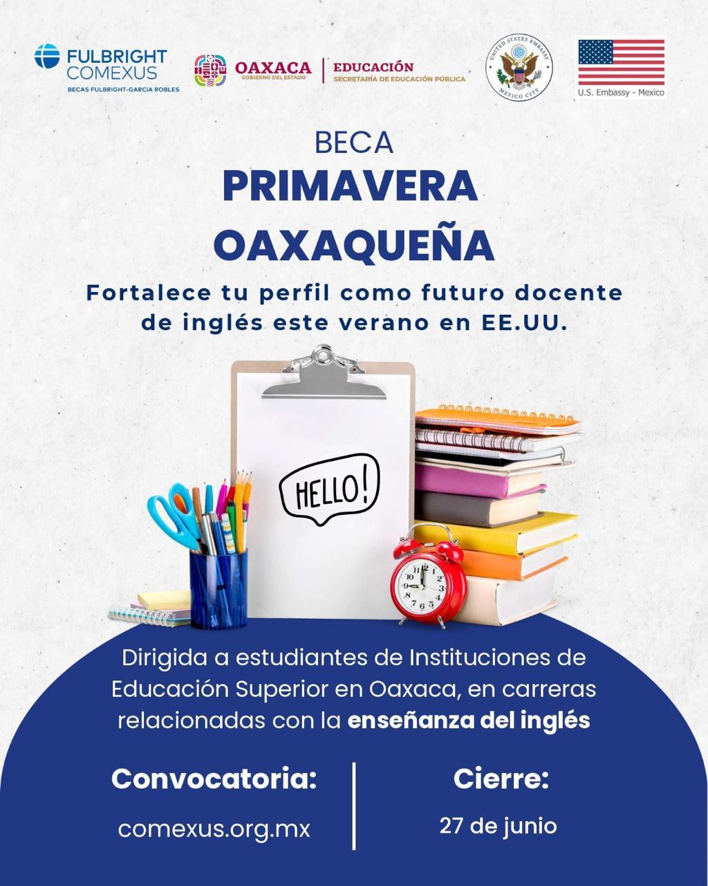 De acuerdo con la convocatoria de esta iniciativa impulsada por el Gobernador Salomón Jara Cruz a través de la Secretaría de Educación Pública del Estado (SEP Oaxaca) en coordinación con la Comisión México-Estados Unidos para el Intercambio Educativo y Cultural (Comexus), está vigente hasta próximo el 27 de junio.