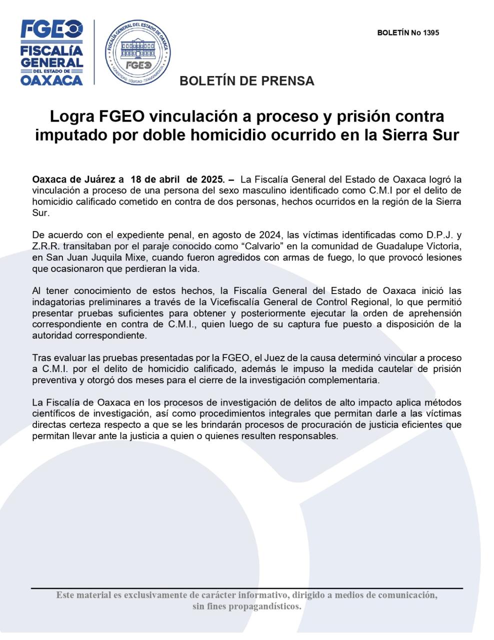 Oaxaca de Juárez a 18 de abril de 2025. – La Fiscalía General del Estado de Oaxaca logró la vinculación a proceso de una persona del sexo masculino identificado como C.M.I por el delito de homicidio calificado cometido en contra de dos personas, hechos ocurridos en la región de la Sierra Sur.