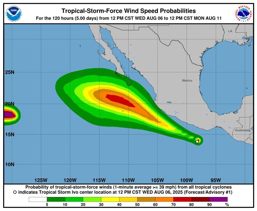 Oaxaca de Juárez, Oax. 6 de agosto de 2025.- La Coordinación Estatal de Protección Civil y Gestión de Riesgos (CEPCyGR) informa que, de acuerdo con el Centro Nacional de Huracanes de Estados Unidos, (NHC, por sus siglas en inglés), la tormenta tropical “Ivo” se localizó este miércoles a las 15:00 horas a 310 kilómetros (km) al sureste de Acapulco, Guerrero, desplazándose rápidamente hacia el oeste-noroeste a 35 kilómetros por hora (km/h).