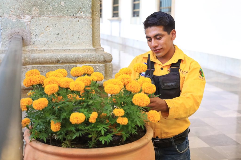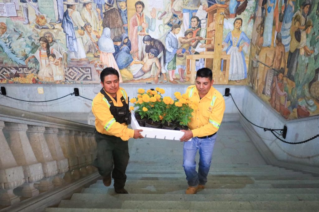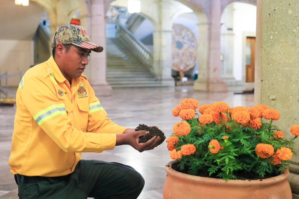 Señaló que por segundo año consecutivo, cerca de 10 mil macetas de flor de cempasúchil serán colocadas en las jardineras del zócalo, y cerca de tres mil más en el altar monumental que se instalará en el Palacio de Gobierno.