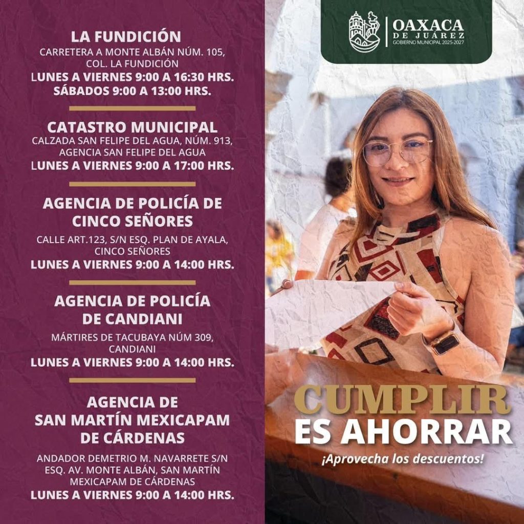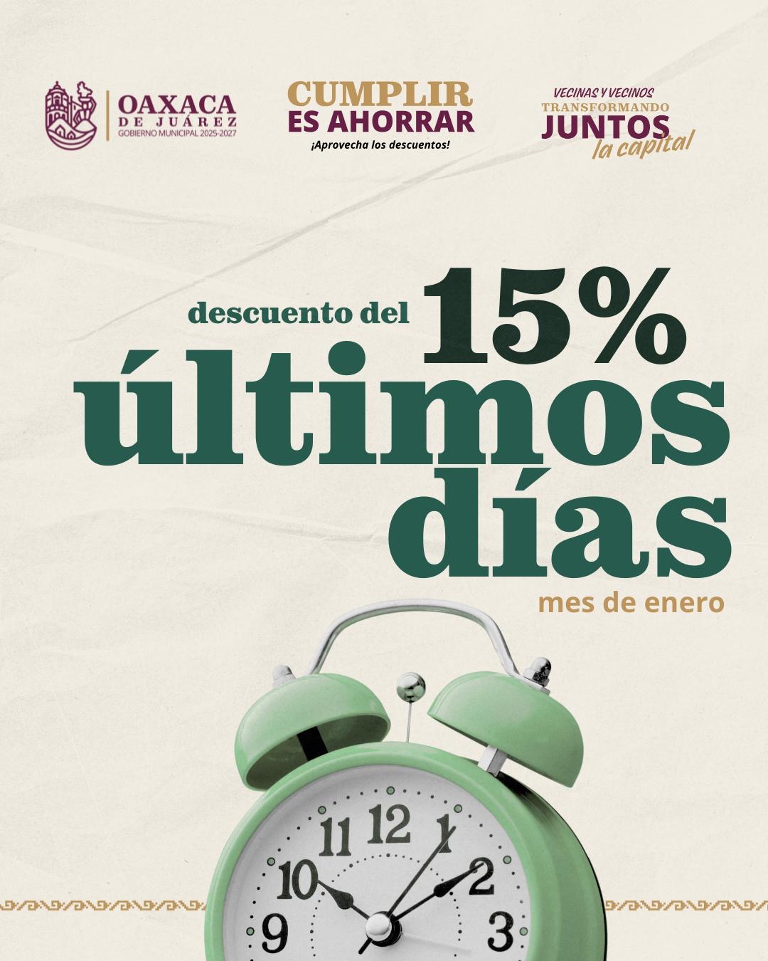 Oaxaca de Juárez, Oax., 30 de enero de 2025. – El Municipio de Oaxaca de Juárez informa que los días 30 y 31 de enero son los últimos en los que se aplica el 15 % de descuento en el pago del predial, lo que representa un ahorro significativo para las vecinas y vecinos.