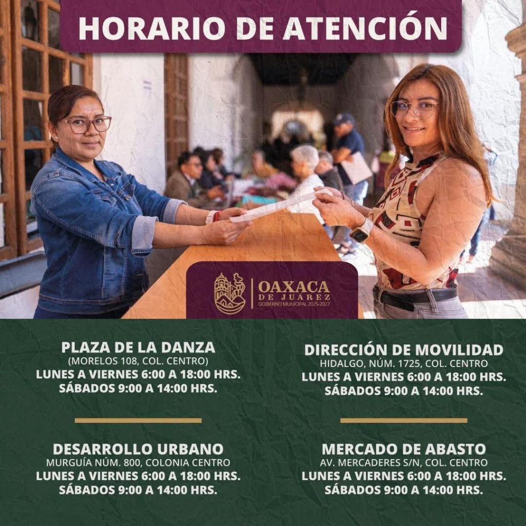 El pago se puede realizar en el Palacio Municipal de Oaxaca de Juárez, ubicado en avenida Morelos 108, de lunes a viernes de 6:00 a 18:00 horas y los sábados de 9:00 a 14:00 horas.