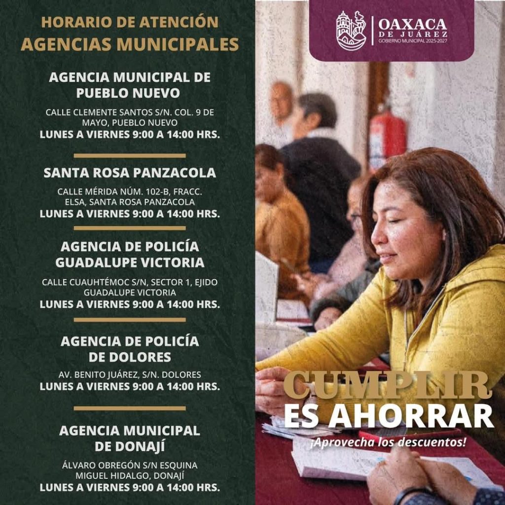 Asimismo, hay cajas recaudadoras en las agencias municipales de Pueblo Nuevo, Santa Rosa Panzacola, Donají, San Martín Mexicapam de Cárdenas y en las agencias de policía de Guadalupe Victoria, Dolores, Cinco Señores y Candiani, con un horario de lunes a viernes de 9:00 a 14:00 horas.