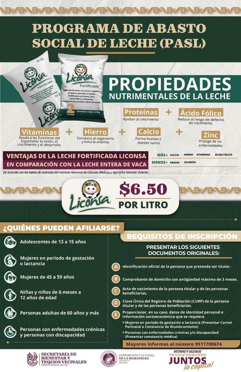 La Secretaría de Bienestar y Tequios Vecinales recuerda que los beneficios de consumir leche fortificada Liconsa son mayores, de acuerdo con las tablas de nutrición del Instituto Nacional de Ciencias Médicas y Nutrición Salvador Zubirán.