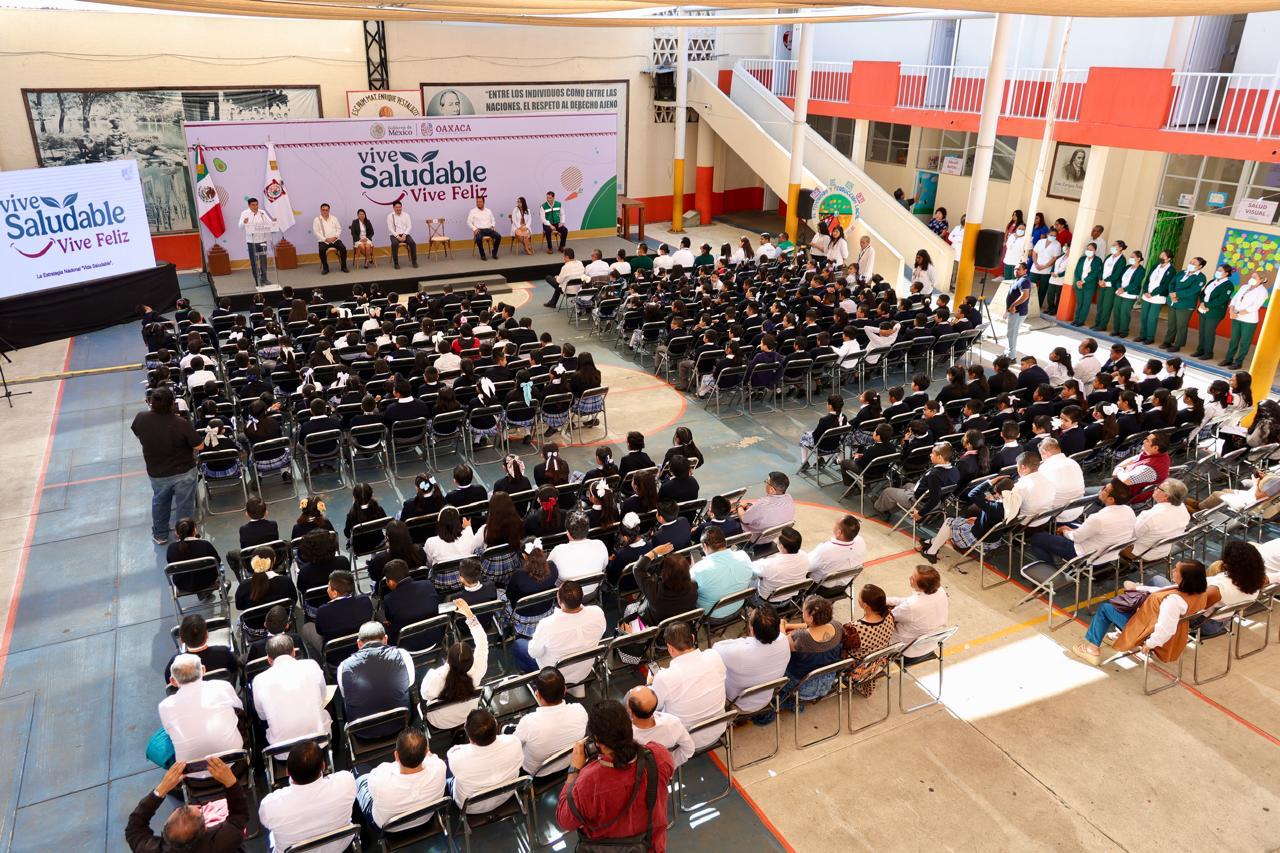 Oaxaca de Juárez, Oax. 12 de marzo de 2025.- Para convertir a las escuelas en espacios de prevención y promoción de la salud, a fin de evitar la venta de comida chatarra y con ello reducir enfermedades como sobrepeso, obesidad y desnutrición en niñas y niños, el Gobernador Salomón Jara Cruz dio inicio en Oaxaca a la estrategia nacional “Vive saludable, vive feliz”.