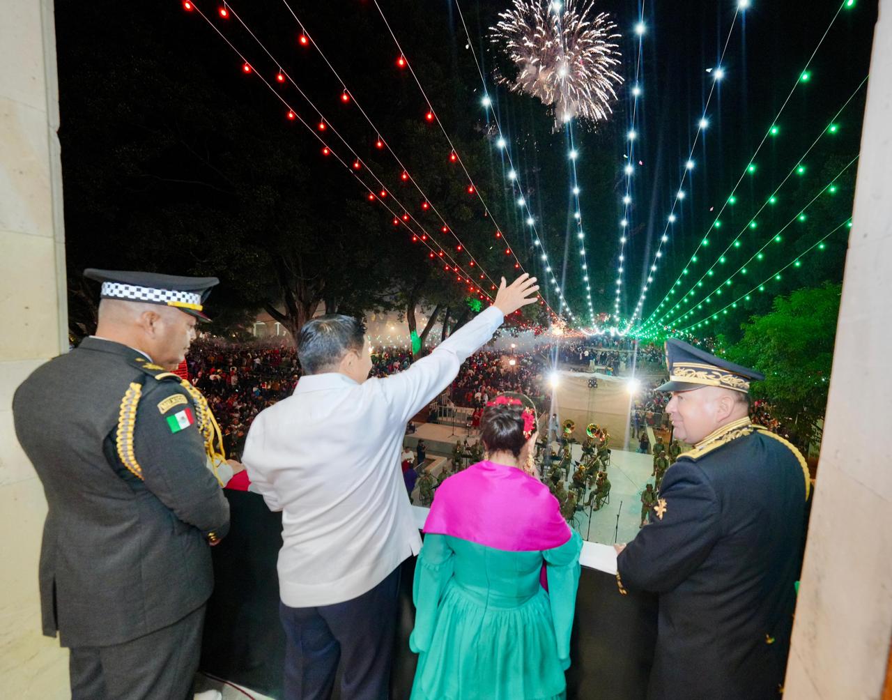 Oaxaca de Juárez, Oax. 15 de septiembre de 2024. La algarabía y fervor patrio de las familias oaxaqueñas se desbordó en la Plaza de la Constitución, al participar en el tradicional Grito de Independencia encabezado por el Gobernador Salomón Jara Cruz desde Palacio de Gobierno.