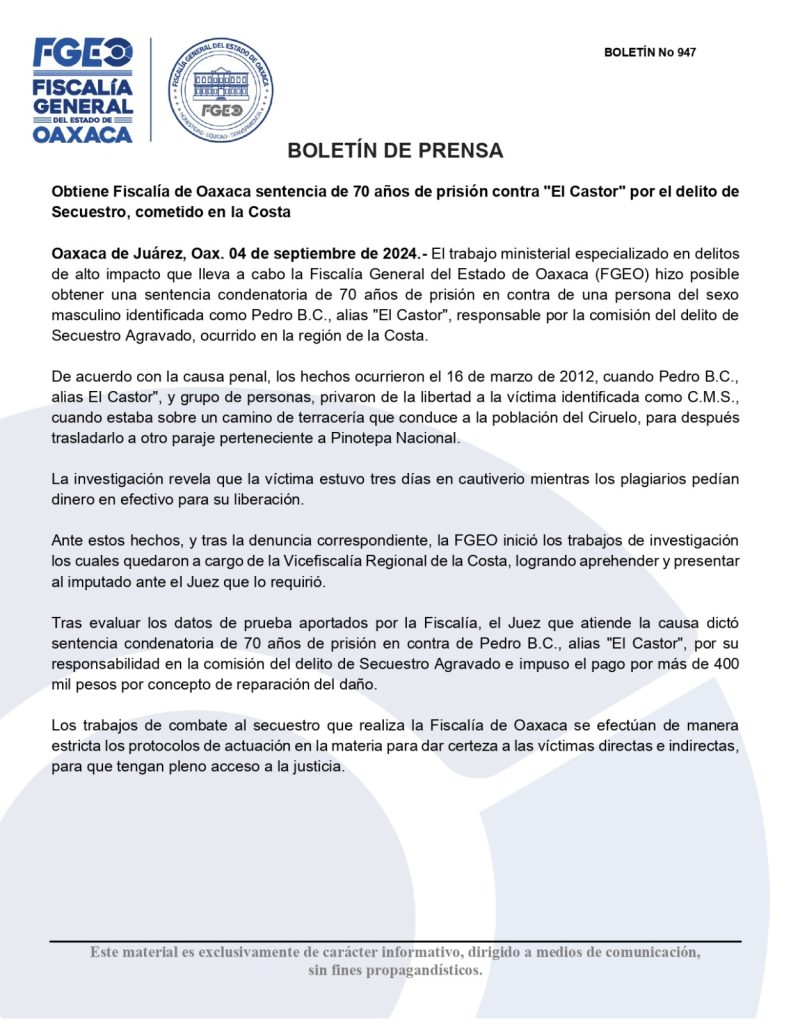 Oaxaca de Juárez, Oax. 04 de septiembre de 2024.- El trabajo ministerial especializado en delitos de alto impacto que lleva a cabo la Fiscalía General del Estado de Oaxaca (FGEO) hizo posible obtener una sentencia condenatoria de 70 años de prisión en contra de una persona del sexo masculino identificada como Pedro B.C., alias «El Castor», responsable por la comisión del delito de Secuestro Agravado, ocurrido en la región de la Costa.