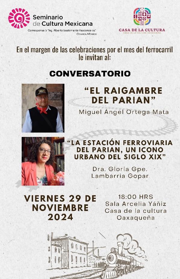 Como parte de las celebraciones por el Mes del Ferrocarrilero, este viernes 29 de noviembre a las 18:00 horas, el expositor Miguel Ángel Ortega Mata impartirá el conversatorio “El Raigambre del Parián”; en tanto, Gloria Guadalupe Lambarria Gopar presentará la conferencia “La Estación Ferroviaria del Parián, ícono urbano del siglo XIX.