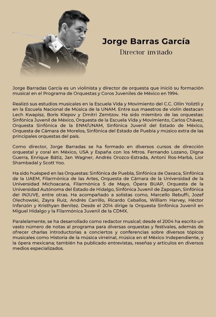 En esta ocasión la OSO será dirigida por Jorge Barradas García, violinista y director de la Orquesta Sinfónica Juvenil de Miguel Hidalgo y la Filarmónica Juvenil de la Ciudad de México.