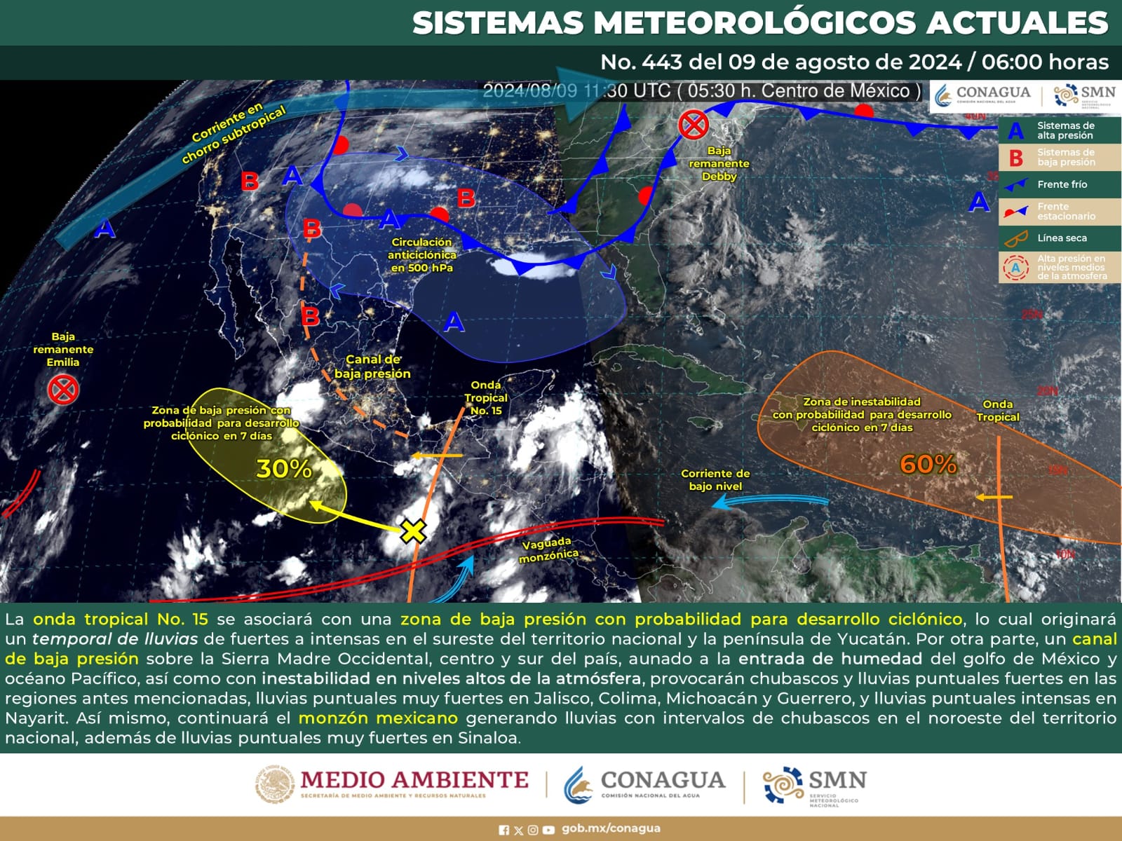 De acuerdo con el pronóstico del tiempo emitido por la Comisión Nacional del Agua (Conagua) esta onda tropical se desplazará durante este día sobre la Península de Yucatán, Veracruz, Chiapas y por la tarde se internará por el oriente del Istmo de Tehuantepec, donde estará interactuando con una baja presión con potencial ciclónico sobre el Golfo de Tehuantepec, ocasionando alta probabilidad de tormentas locales de corta duración y rápido desplazamiento.