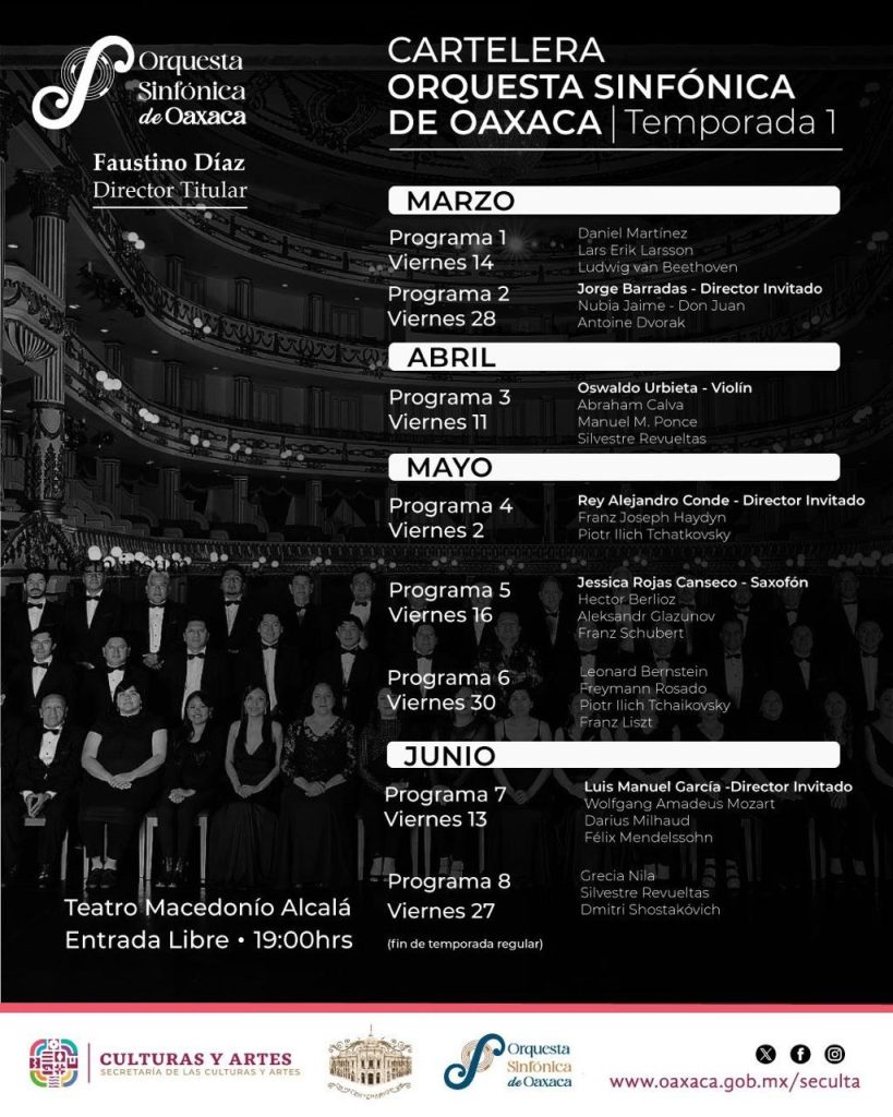 Oaxaca de Juárez, Oax. 11 de marzo de 2025.- La Orquesta Sinfónica de Oaxaca (OSO) dirigida por el músico oaxaqueño Faustino Diaz, arranca este viernes 14 de marzo la nueva temporada de conciertos en el teatro Macedonio Alcalá, a las 19:00 horas, con acceso gratuito.