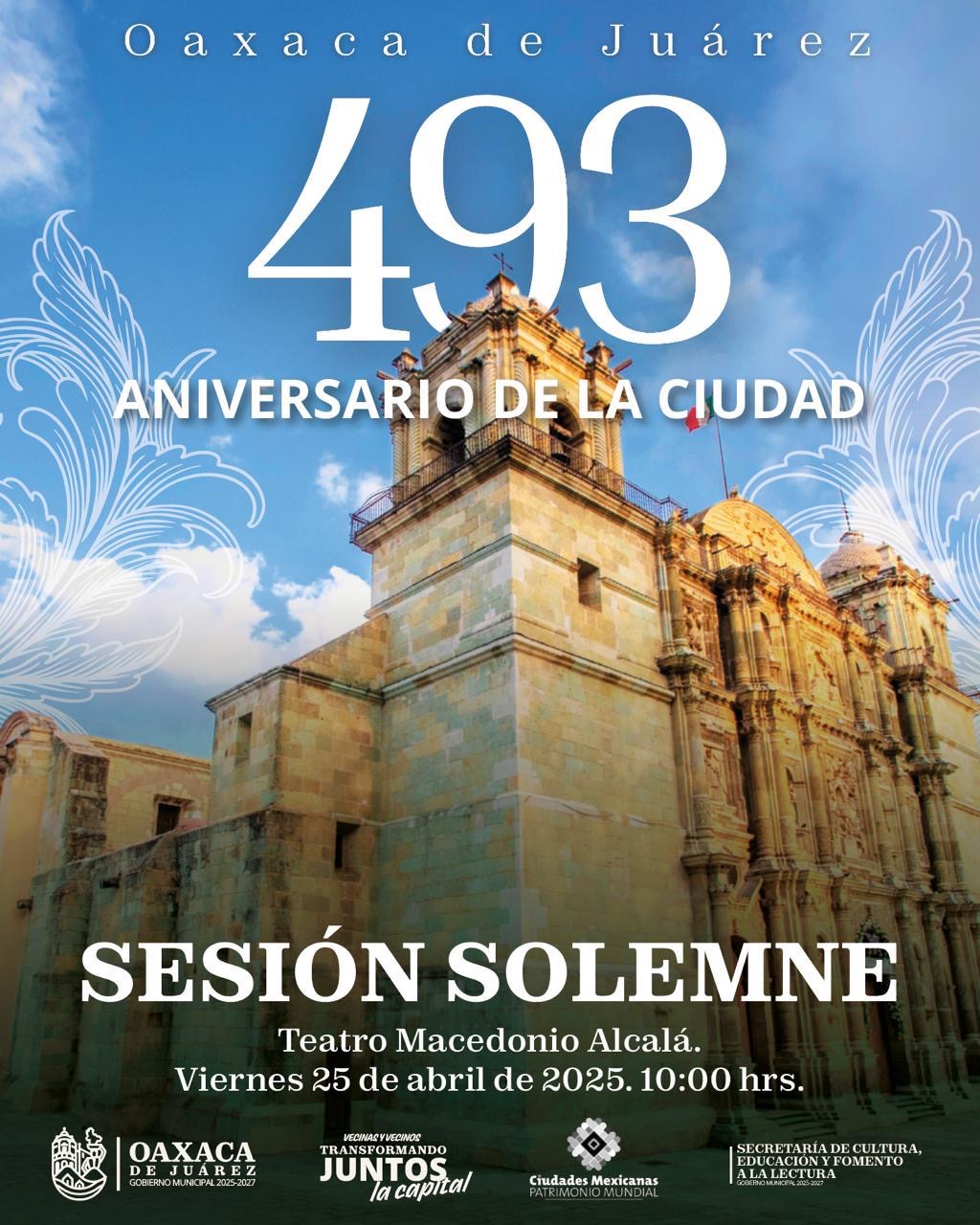 - Sesión Solemne de Cabido por el 493 Aniversario de la Ciudad de Oaxaca. (10:00 hrs.)