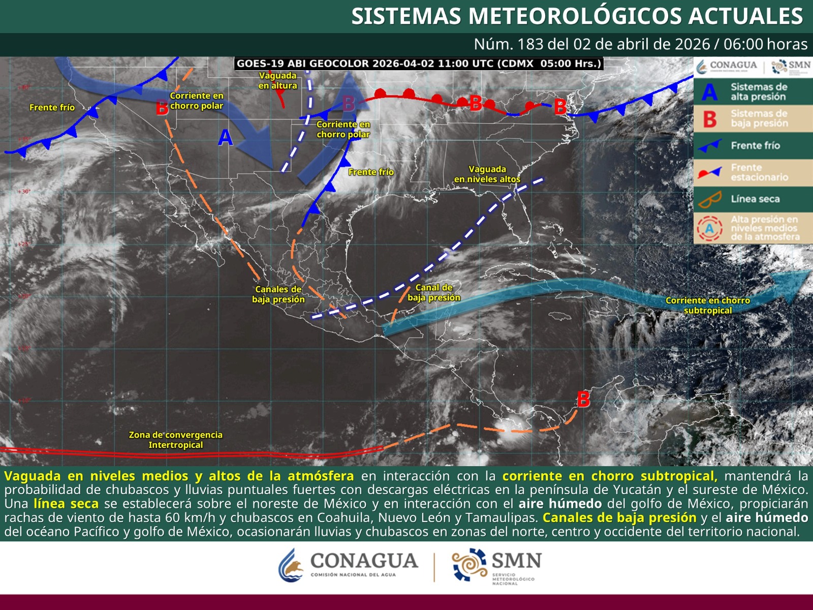 Estas condiciones se deben a la presencia de una vaguada ubicada en niveles medios y altos de la atmósfera, que interactuará con un canal de baja presión sobre el interior de la República Mexicana, así como con el calentamiento diurno y orografía local.