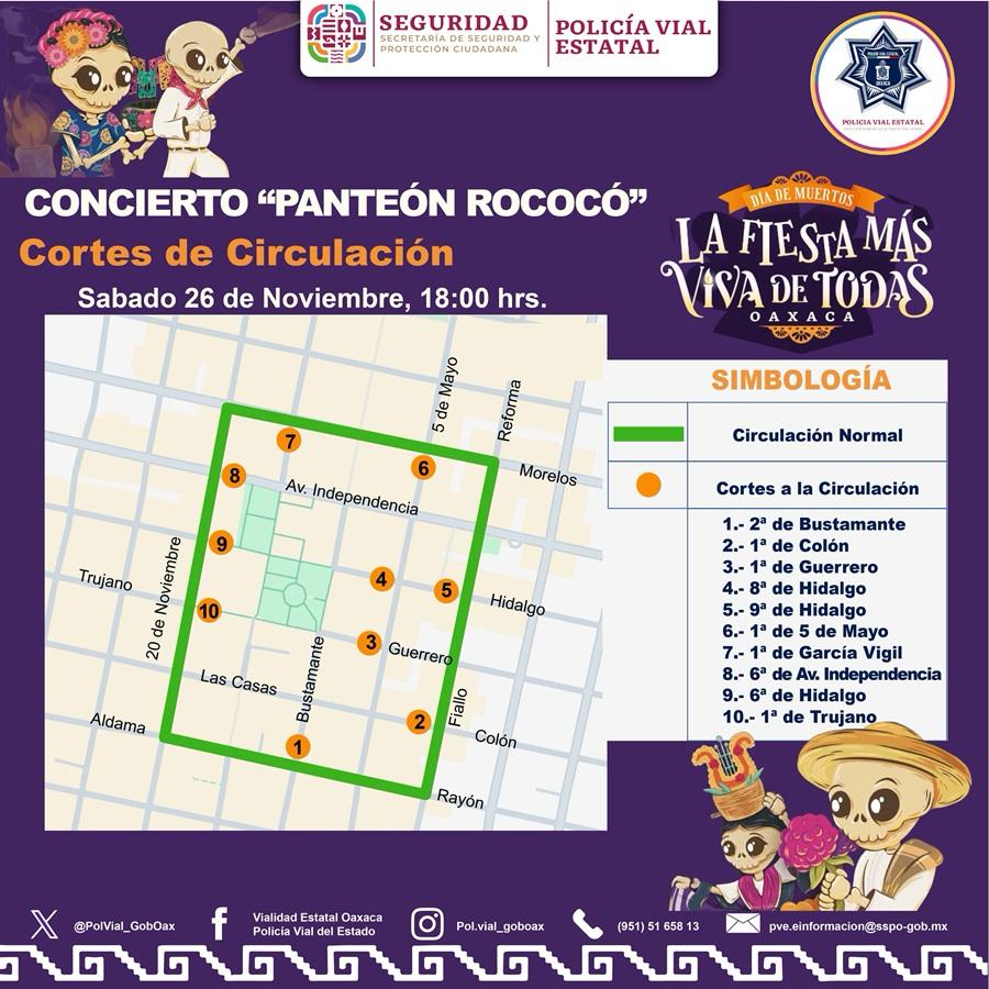 Oaxaca de Juárez, Oax. 25 de octubre de 2024. La Policía Vial del Estado informa que este sábado 26, realizará cortes a la circulación con motivo del concierto que presentará el grupo “Panteón Rococó” en la Alameda de León.