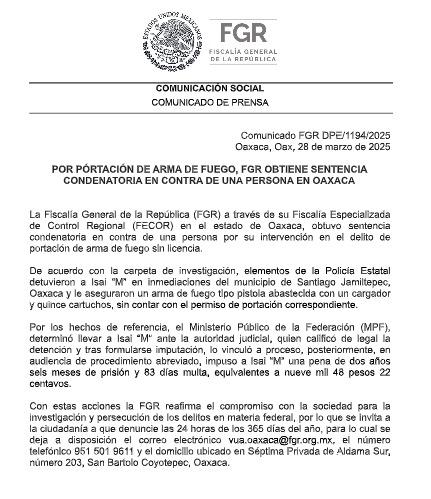 La Fiscalía General de la República (FGR) a través de su Fiscalía Especializada de Control Regional (FECOR) en el estado de Oaxaca, obtuvo sentencia condenatoria en contra de una persona por su intervención en el delito de portación de arma de fuego sin licencia.