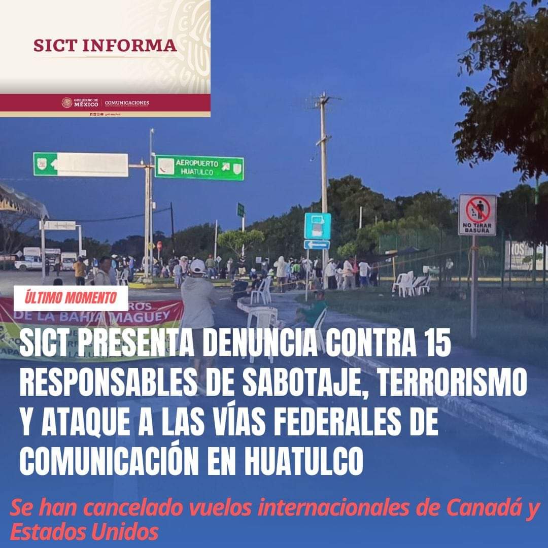 Ciudad de México; 10 de agosto de 2024. Esta mañana la oficina de comunicación de la Secretaría de Comunicaciones y Transportes, dio a conocer que han presentado 15 denuncias contra el mismo números de personas por sabotaje, terrorismo y ataque a las vías federales de comunicación en Santa María Huatulco.