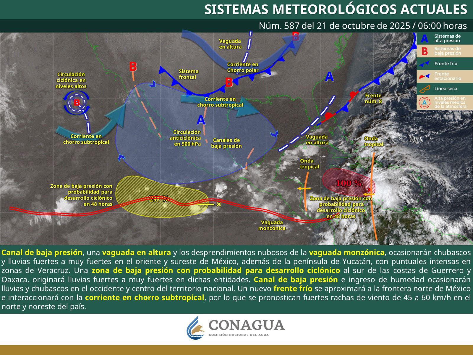Lo anterior es ocasionado por una zona de baja presión con probabilidad de desarrollo ciclónico al sur de las costas de Oaxaca, en combinación con la vaguada monzónica, localizada próxima a la línea de costa; las cuales impulsarán aire húmedo y cálido.