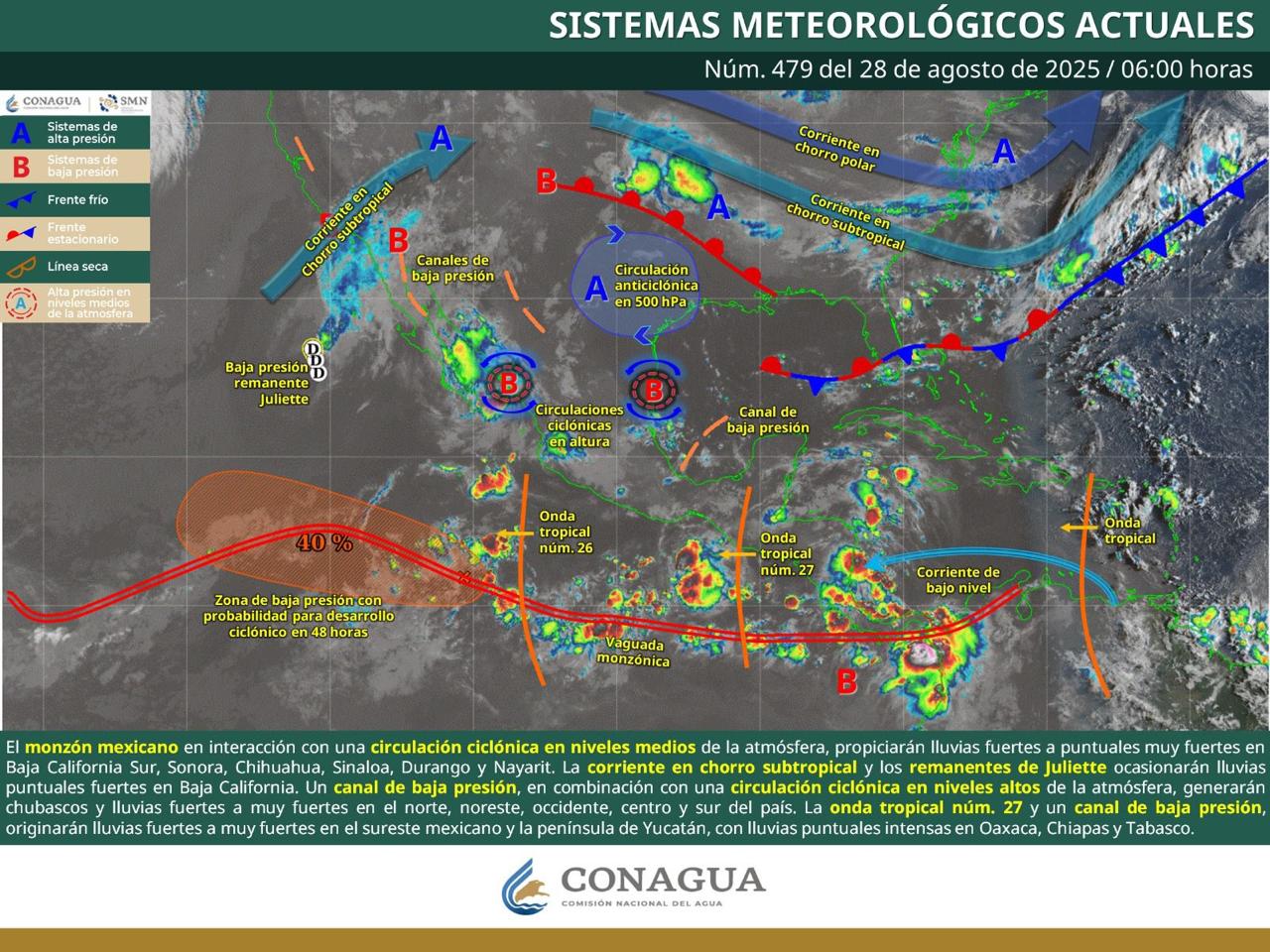 Todo esto es ocasionado por la onda tropical número 27 sobre el sureste de México, que avanza hacia el oeste a una velocidad promedio de 25 kilómetros por hora, apoyada por un canal de baja presión.De acuerdo con el pronóstico del tiempo emitido por la Conagua Comisión Nacional del Agua (Conagua), las temperaturas máximas tendrán poco cambio, mientras que las mínimas presentarán ligeros descensos en la madrugada, con nieblas densas al amanecer en zonas de la Sierra Sur, Sierra de Juárez y Sierra de Flores Magón.