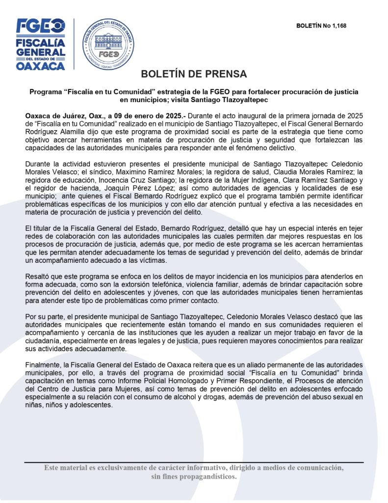 Finalmente, la Fiscalía General del Estado de Oaxaca reitera que es un aliado permanente de las autoridades municipales, por ello, a través del programa de proximidad social “Fiscalía en tu Comunidad” brinda capacitación en temas como Informe Policial Homologado y Primer Respondiente, el Procesos de atención del Centro de Justicia para Mujeres, así como temas de prevención del delito en adolescentes enfocado especialmente a su relación con el consumo de alcohol y drogas, además de prevención del abuso sexual en niñas, niños y adolescentes.