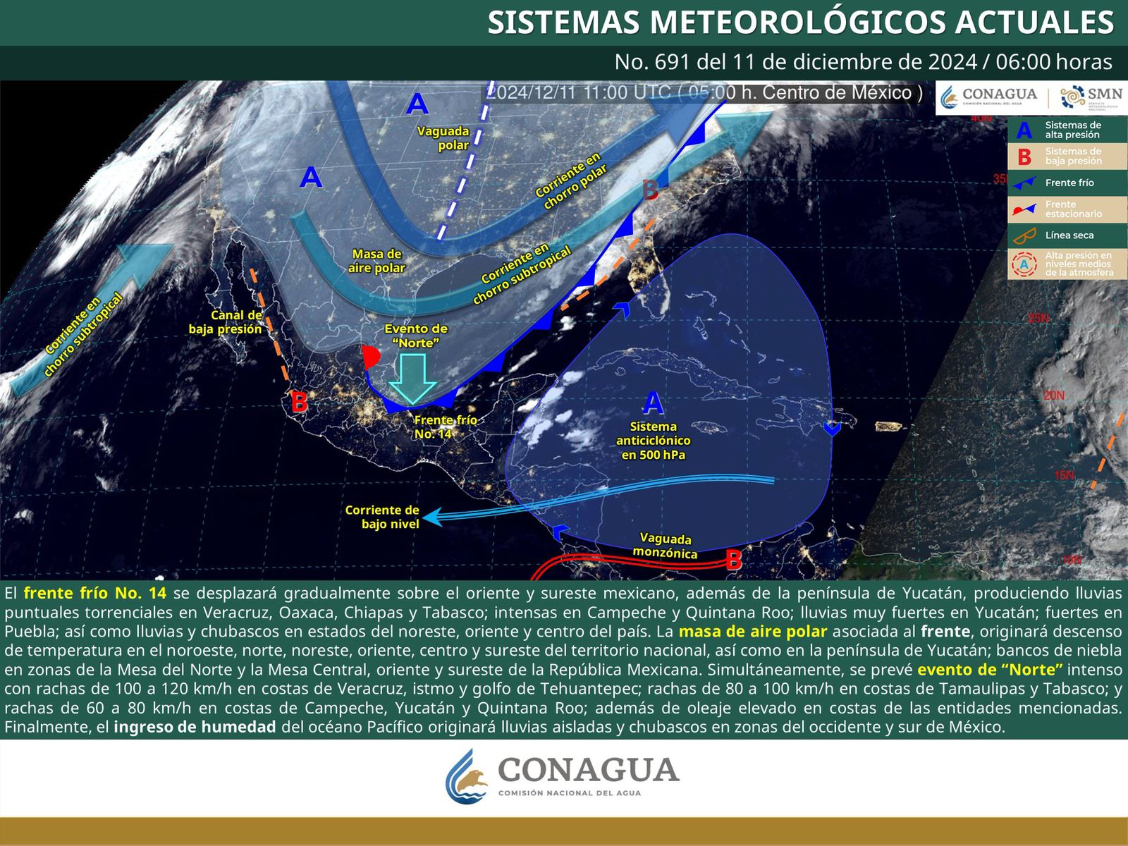 De acuerdo con el pronóstico del tiempo emitido por la Comisión Nacional del Agua (Conagua), este sistema avanzará durante el día sobre el Golfo de México, oriente y sureste del país; por la tarde alcanzará la Península de Yucatán, dejando lluvias de intensidad variable en la mitad norte del estado de Oaxaca.