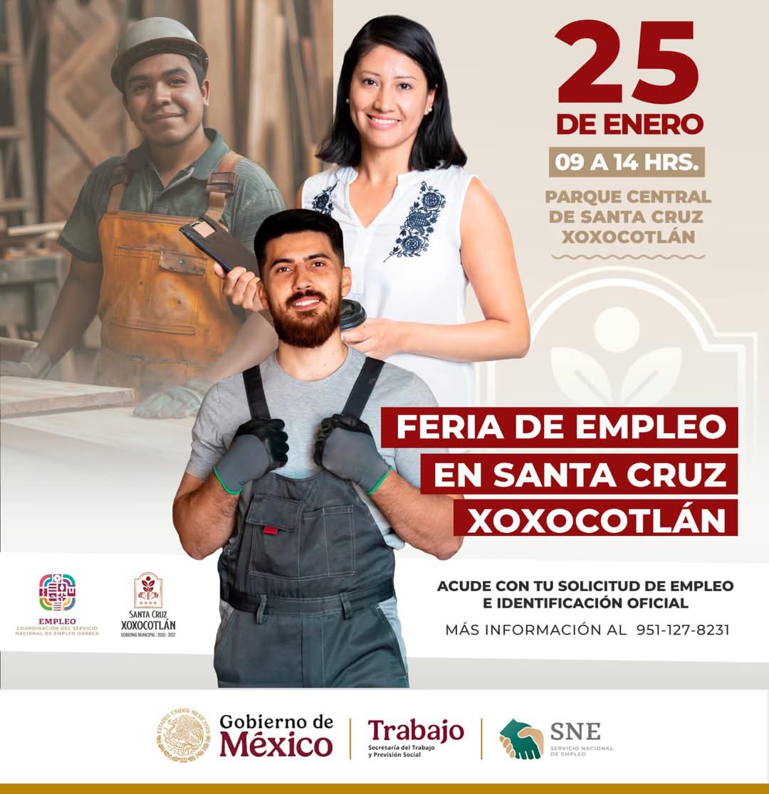 Santa Cruz Xoxocotlán, Oax., 21 de enero de 2025.- El gobierno municipal de Santa Cruz Xoxocotlán invita a las y los ciudadanos que están en búsqueda de un trabajo, a conocer las ofertas laborales durante la «Primera feria del empleo 2025».