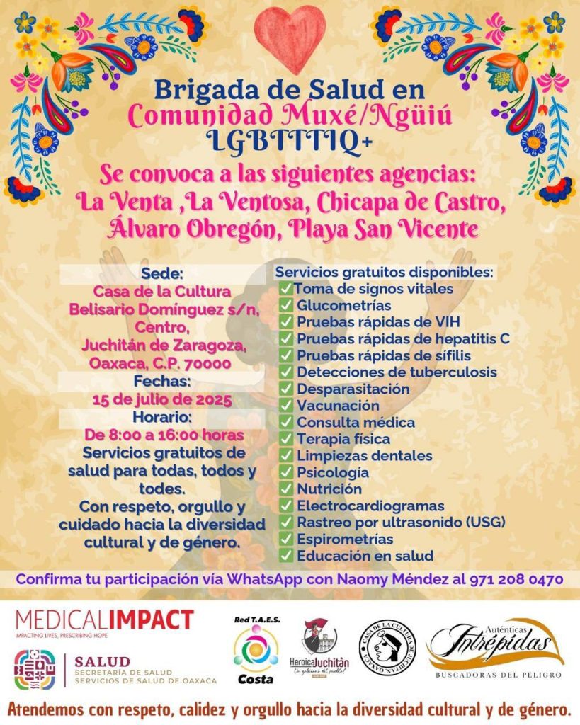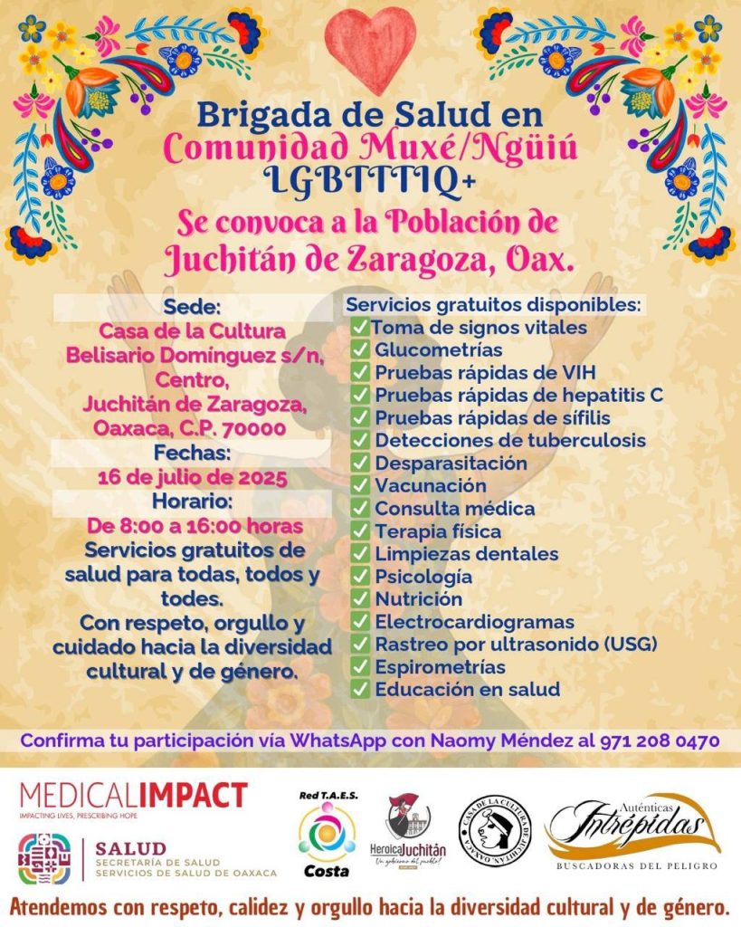 Con el objetivo de acercar servicios médicos gratuitos, dignos y con enfoque de derechos humanos a la población, Servicios de Salud de Oaxaca (SSO), en coordinación con la Organización No Gubernamental Medical Impact y la Red TAES (Tratamiento Acortado Estrictamente Supervisado) de Tuberculosis Costa, realizará brigadas de salud dirigidas a la comunidad Muxé/Ngüiú (LGBTTTIQ+).