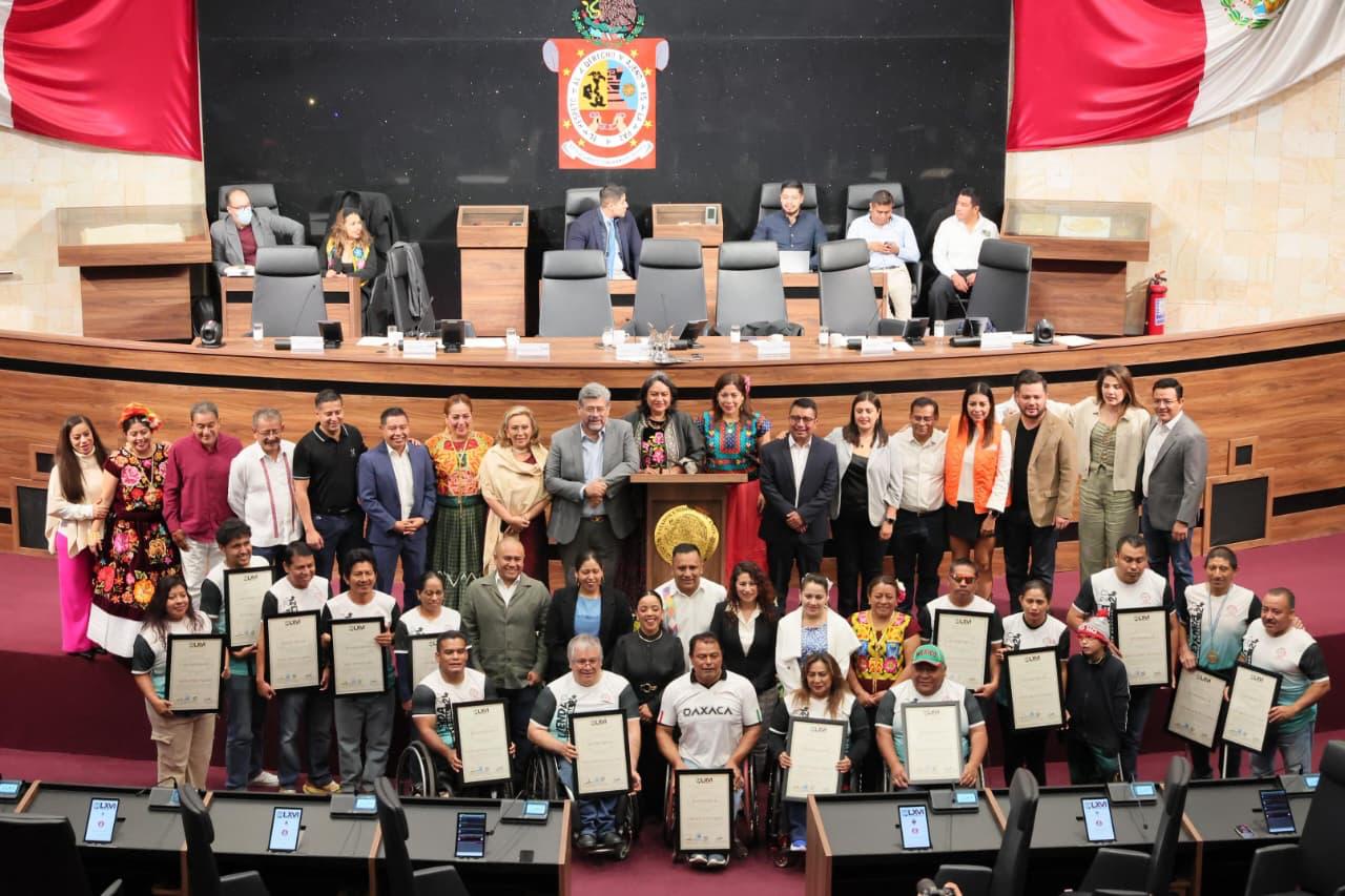 San Raymundo Jalpan, Oaxaca, a 09 de diciembre de 2025.- Con el propósito de destacar la trayectoria de las y los atletas oaxaqueños que mediante el deporte adaptado han puesto en alto el nombre de la entidad, la LXVI Legislatura del H. Congreso del Estado de Oaxaca celebró una Sesión Solemne para entregar reconocimientos a la Asociación de Medallistas Paralímpicos Mundialistas y Panamericanos del Estado.