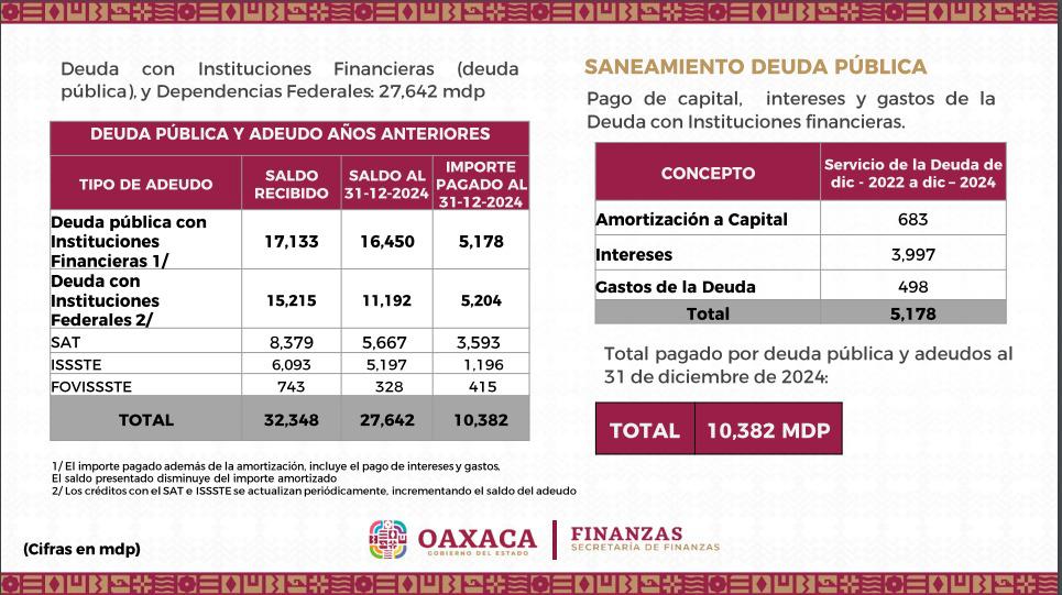 El titular de la Sefin, Farid Acevedo López dio a conocer que en el gobierno de Ulises Ruiz Ortiz dejó una deuda con instituciones financieras de 1 mil 434 millones de pesos; Gabino Cué, 15 mil 721 millones de pesos y Alejandro Murat, 17 mil 133 millones de pesos.