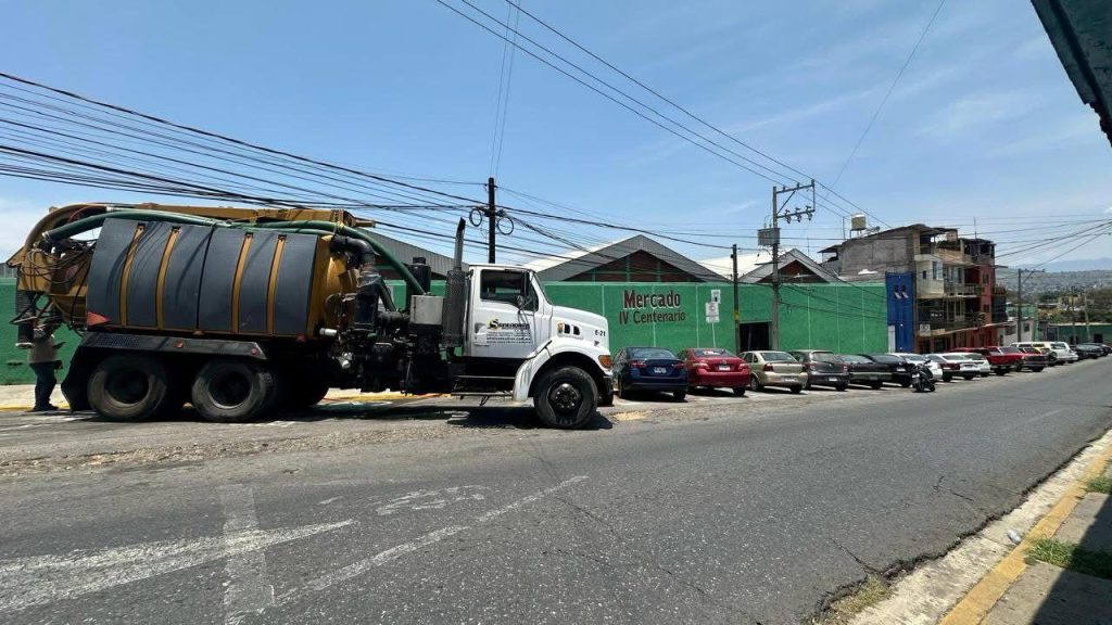 Asimismo, se realizaron trabajos de desazolve con equipo Vactor en el Mercado IV Centenario, contribuyendo a evitar encharcamientos y fortalecer la seguridad sanitaria para locatarias, locatarios y visitantes.
