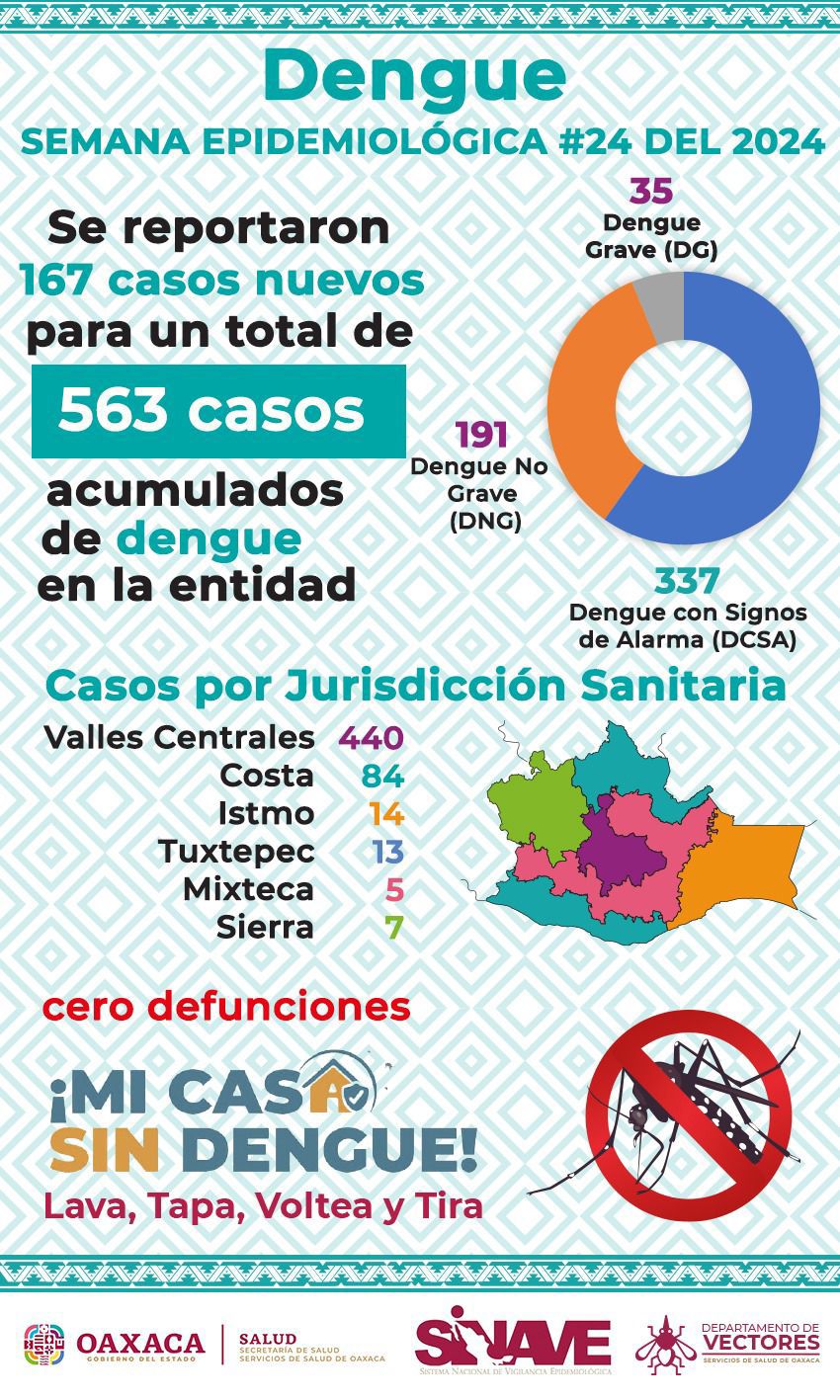 Oaxaca de Juárez, Oax. 19 de junio de 2024.- Durante la primera emisión del Informe Preliminar Semanal de Dengue 2024 de los Servicios de Salud de Oaxaca (SSO) emitido a través de las plataformas de la Corporación Oaxaqueña de Radio y Televisión (Cortv), se dio a conocer que hasta la semana epidemiológica número 24 se registraron 167 casos nuevos de la enfermedad, sin defunciones confirmadas.