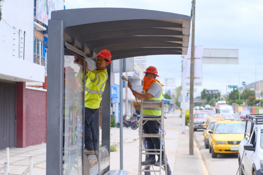 Oaxaca de Juárez, Oax. 14 de julio de 2025.- En el marco de Julio, mes de la Guelaguetza 2025, la Secretaría de Infraestructuras y Comunicaciones (SIC), realiza la rehabilitación de 30 parabuses del corredor troncal Viguera – Xoxocotlán, del Sistema de Transporte Colectivo Metropolitano BinniBus, con el objetivo de ofrecer a la ciudadanía y visitantes módulos de espera en óptimas condiciones.