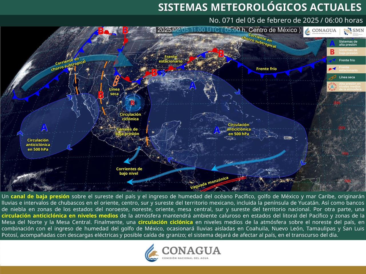 De acuerdo con el pronóstico del tiempo emitido por la Comisión Nacional del Agua (Conagua), un canal de baja presión sobre el sureste de México ocasionará algunas áreas de nublados por la tarde con probabilidad de tormentas escasas, rachas de viento y corrientes descendentes (turbulencia) debajo de la nube de tormenta, además de remolinos antes de ocultarse el sol.