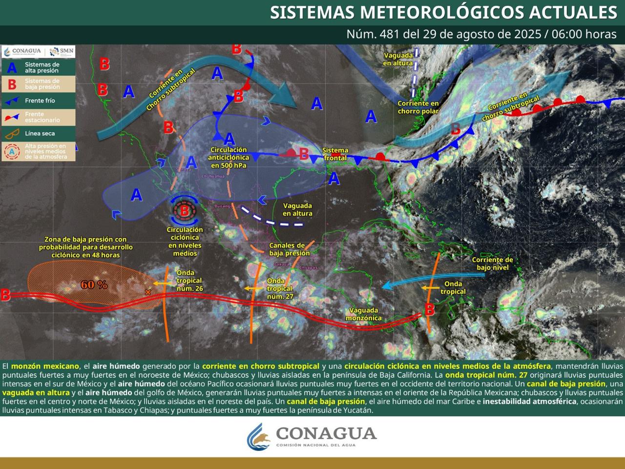 Oaxaca de Juárez, Oax. 29 de agosto de 2025.- La Coordinación Estatal de Protección Civil y Gestión de Riesgos (CEPCyGR) informa que se mantendrá inestabilidad en la mayor parte de Oaxaca, con cielos con pocas nubes por la mañana a cubiertos por la tarde y noche, así como precipitaciones de intensidad variable y tormentas localmente fuertes acompañadas con chubascos, actividad eléctrica y rachas fuertes de viento.