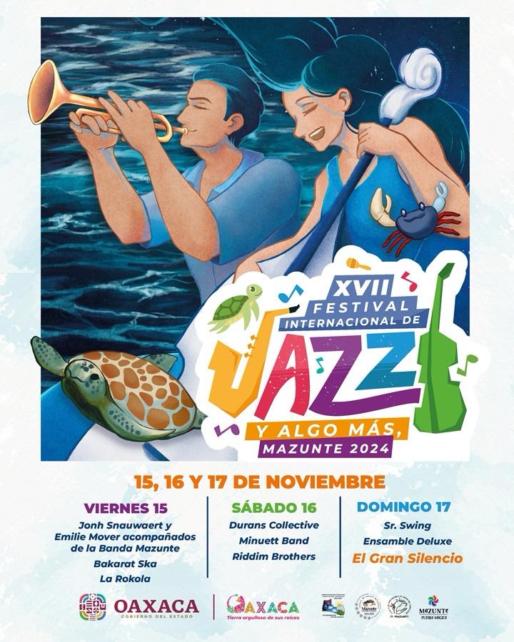 La XVII edición iniciará el 15 de noviembre con una calenda a las 17:00 horas, y en los días subsecuentes las presentaciones de John Snauwaert, Emilie Mover con la Banda de Mazunte, Durans Collective, Minuett Band, Riddim Brothers, Señor Swing, Ensamble Deluxe y el cierre con El Gran Silencio.
