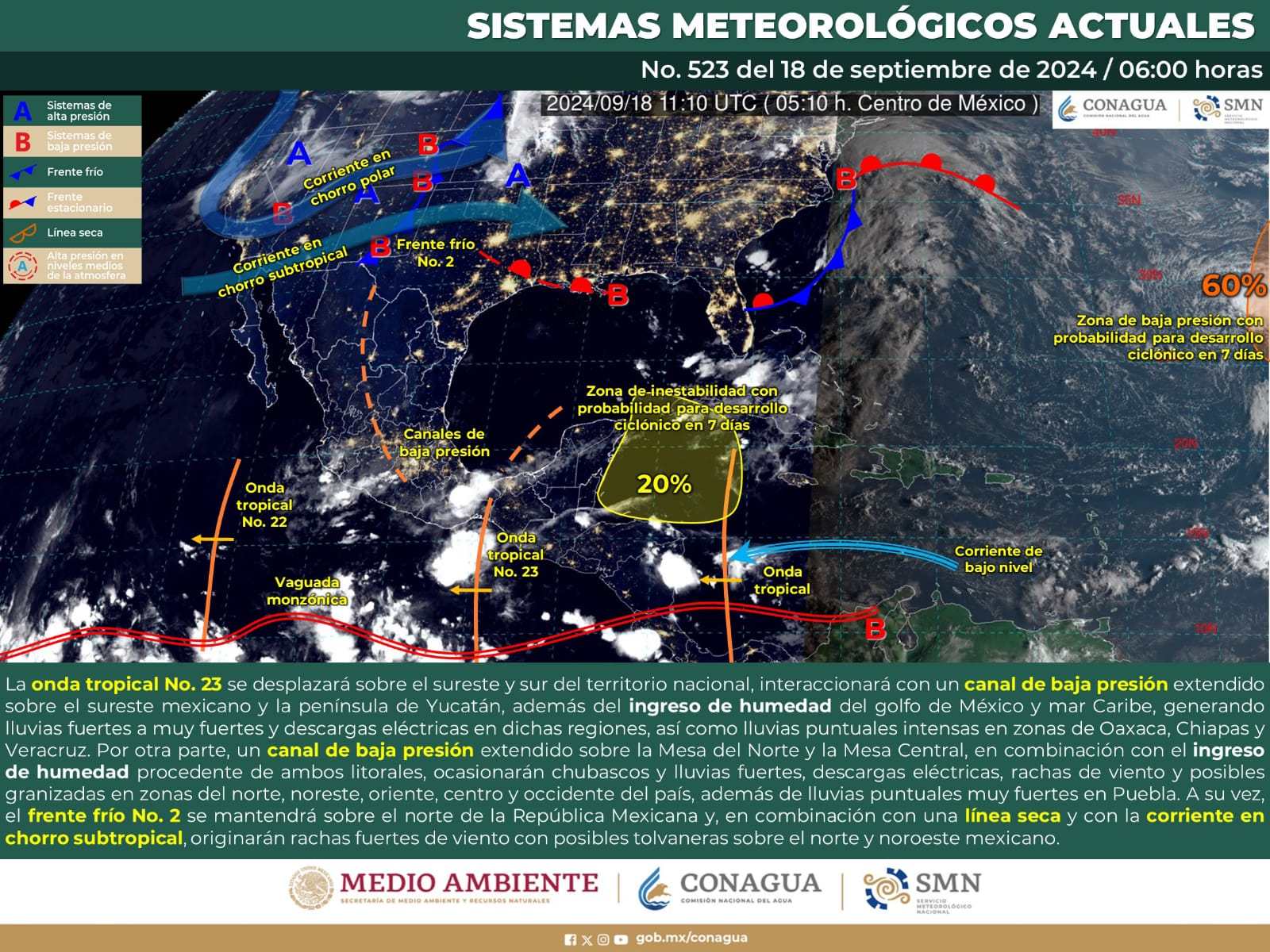 De acuerdo con el pronóstico del tiempo emitido por la Comisión Nacional del Agua (Conagua), la onda tropical número 23 y un canal de baja presión, mantendrán alto contenido de humedad en gran parte del estado, favoreciendo estas condiciones atmosféricas.