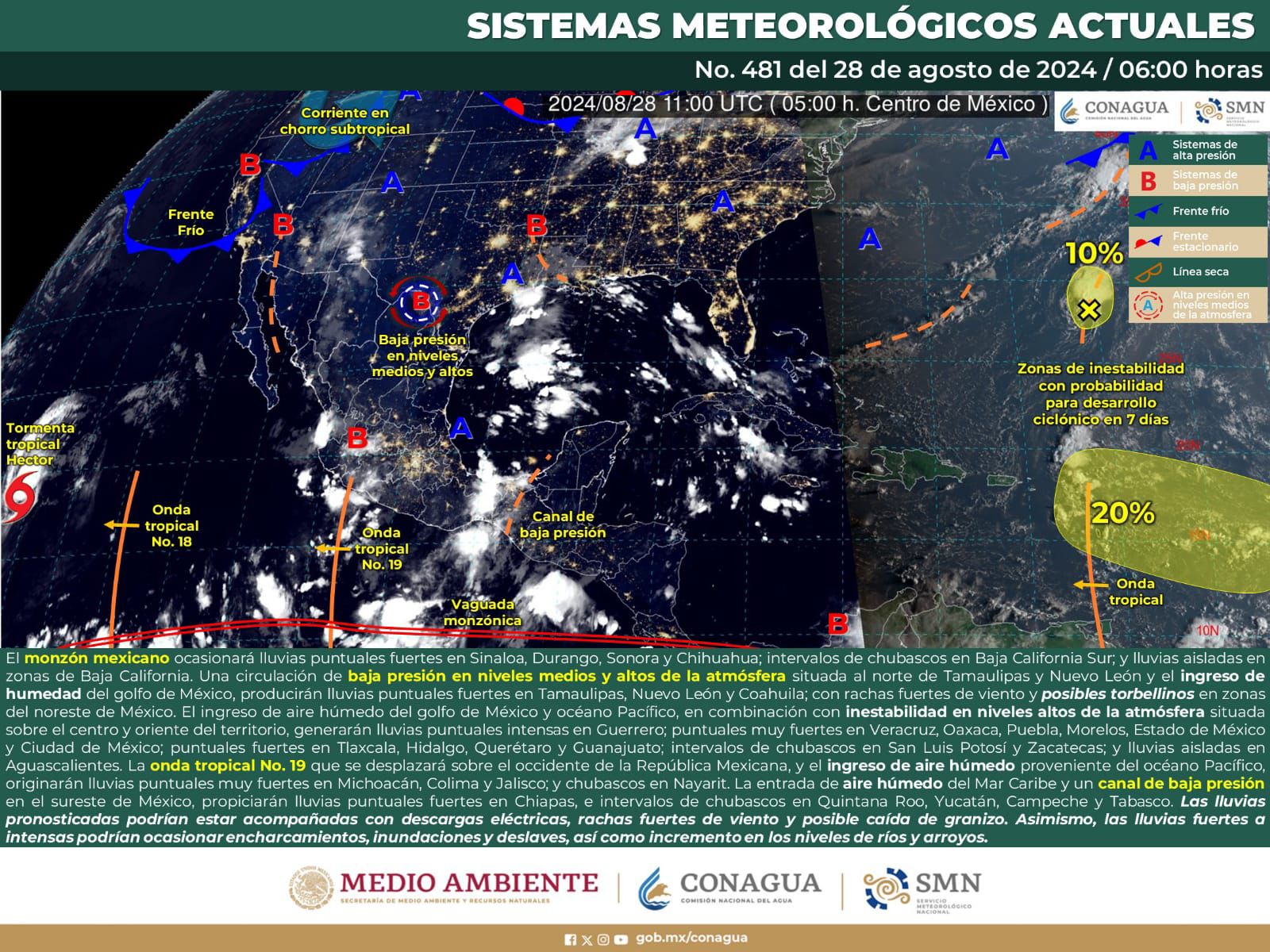 De acuerdo con el pronóstico del tiempo emitido por la Comisión Nacional del Agua (Conagua), esto es a causa de un canal de baja presión -que genera tiempo inestable- y el ingreso de humedad del Océano Pacífico.