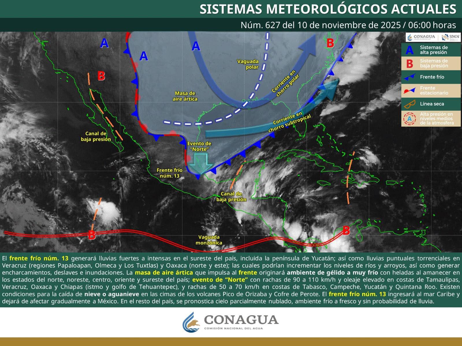 De acuerdo con el pronóstico del tiempo emitido por la Comisión Nacional del Agua (Conagua), los fenómenos se deben al paso del frente frío número 13, que además, provocará áreas de niebla muy densa en zonas serranas que pueden reducir la visibilidad horizontal.