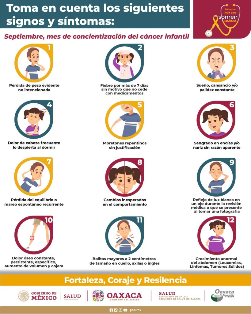 La dependencia recomienda a la población llevar a las niñas y niños al médico ante síntomas como fiebre, pérdida de peso, aumento anormal del tamaño de los ganglios linfáticos, palidez de piel y mucosas, puntos rojos, sangrado de encías, hemorragia nasal, reflejo blanco del ojo, crecimiento del hígado o el bazo, fatiga, así como dolor de cabeza, en extremidades y abdominal.