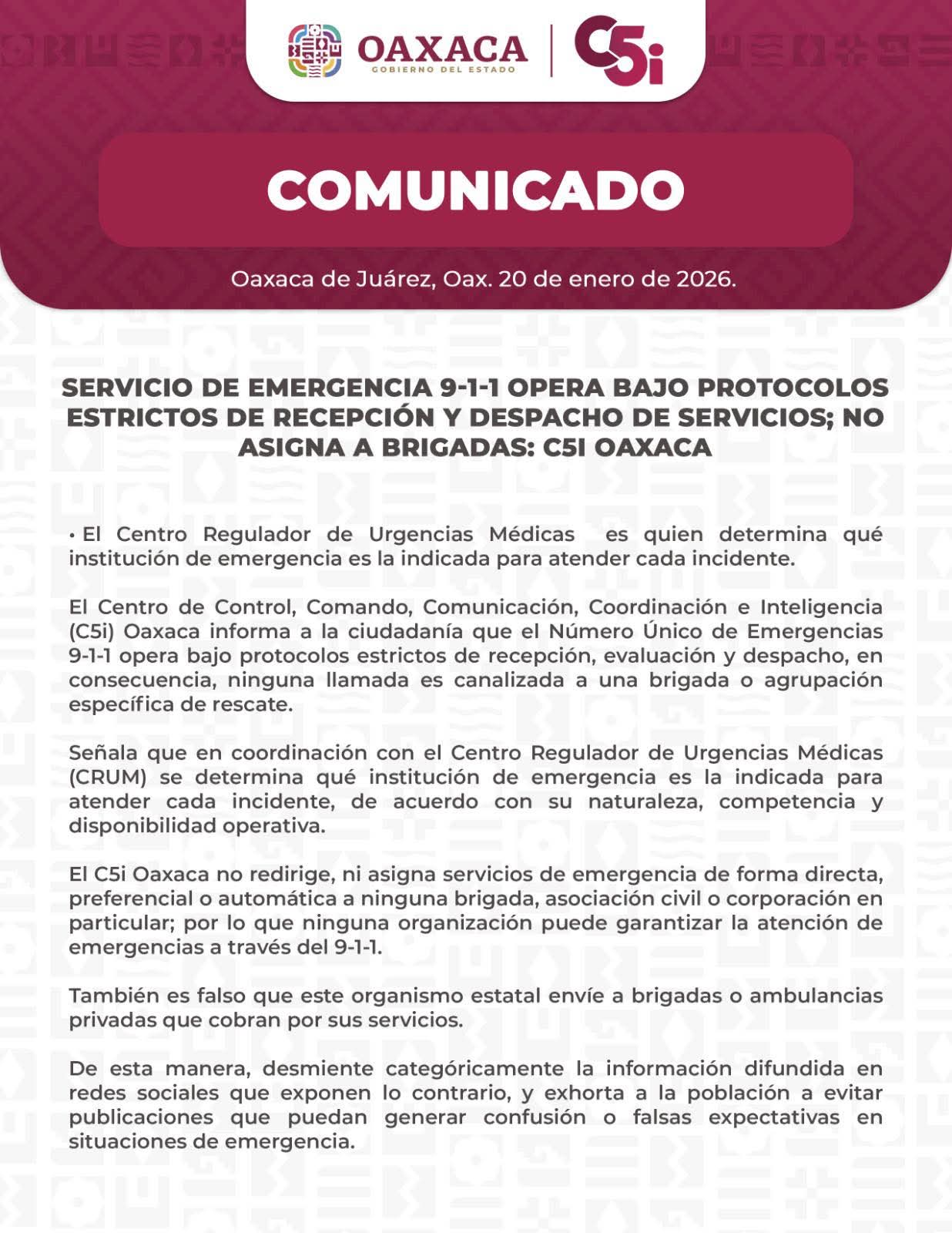 Oaxaca de Juárez, Oax. 20 de enero de 2026. El Centro de Control, Comando, Comunicación, Coordinación e Inteligencia (C5i) Oaxaca informa a la ciudadanía que el Número Único de Emergencias 9-1-1 opera bajo protocolos estrictos de recepción, evaluación y despacho, en consecuencia, ninguna llamada es canalizada a una brigada o agrupación específica de rescate.