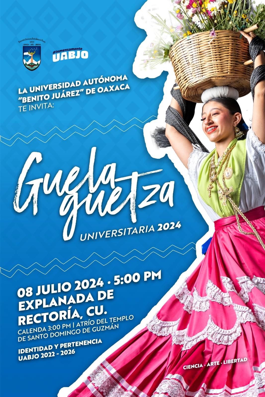 La UABJO Universidad Autónoma «Benito Juárez» de Oaxaca, nuevamente se suma a la máxima fiesta de las y los oaxaqueños; y por tercera ocasión la alegría y tradición de la Guelaguetza Universitaria podrá admirarse en la Explanada de Rectoría el lunes 8 de julio, con 16 bailes presentados por 500 estudiantes de las diferentes Escuelas y Facultades.