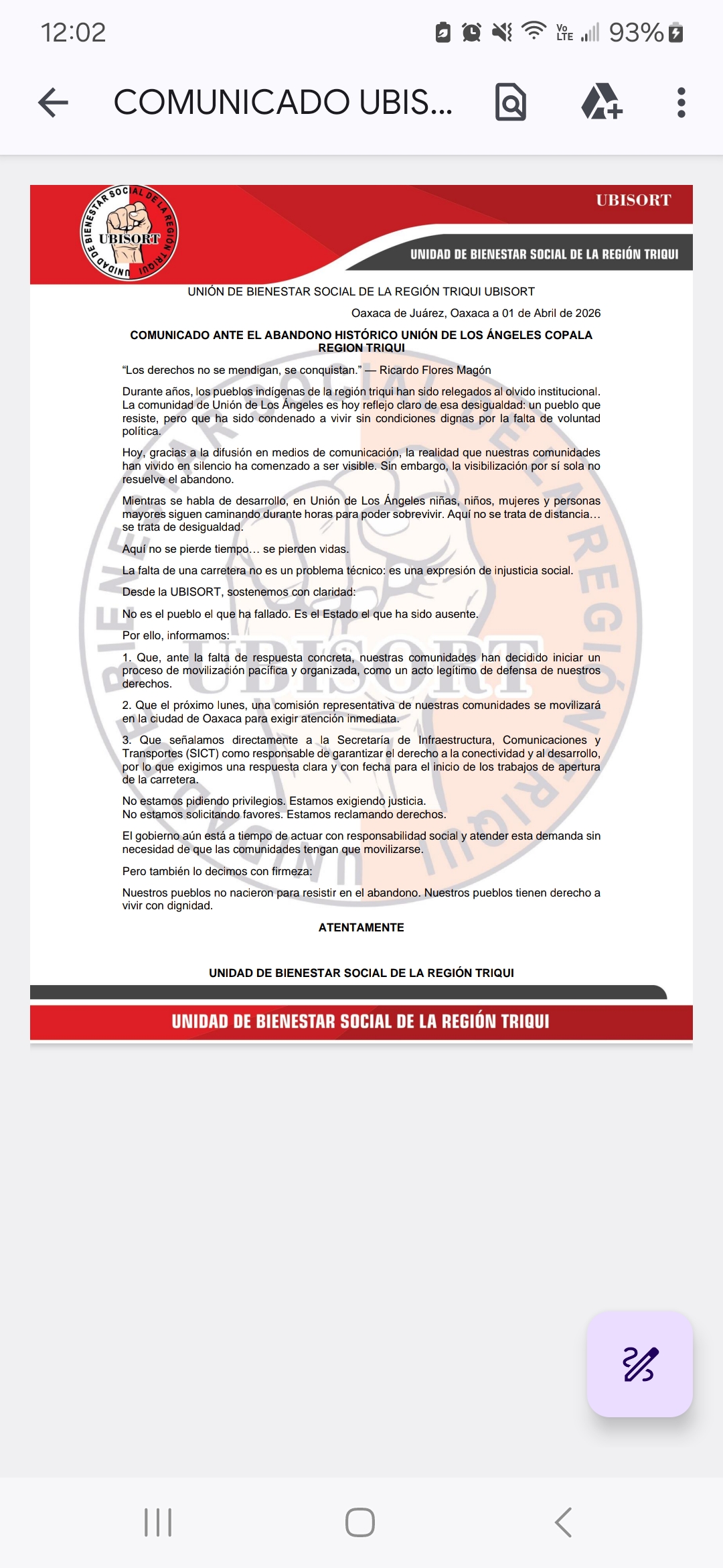 La Unión de Bienestar Social de la Región Triqui (#UBISORT) denunció el abandono histórico que enfrentan comunidades como Unión de Los Ángeles Copala, donde la falta de infraestructura básica, particularmente una carretera, mantiene a la población en condiciones de alta marginación.