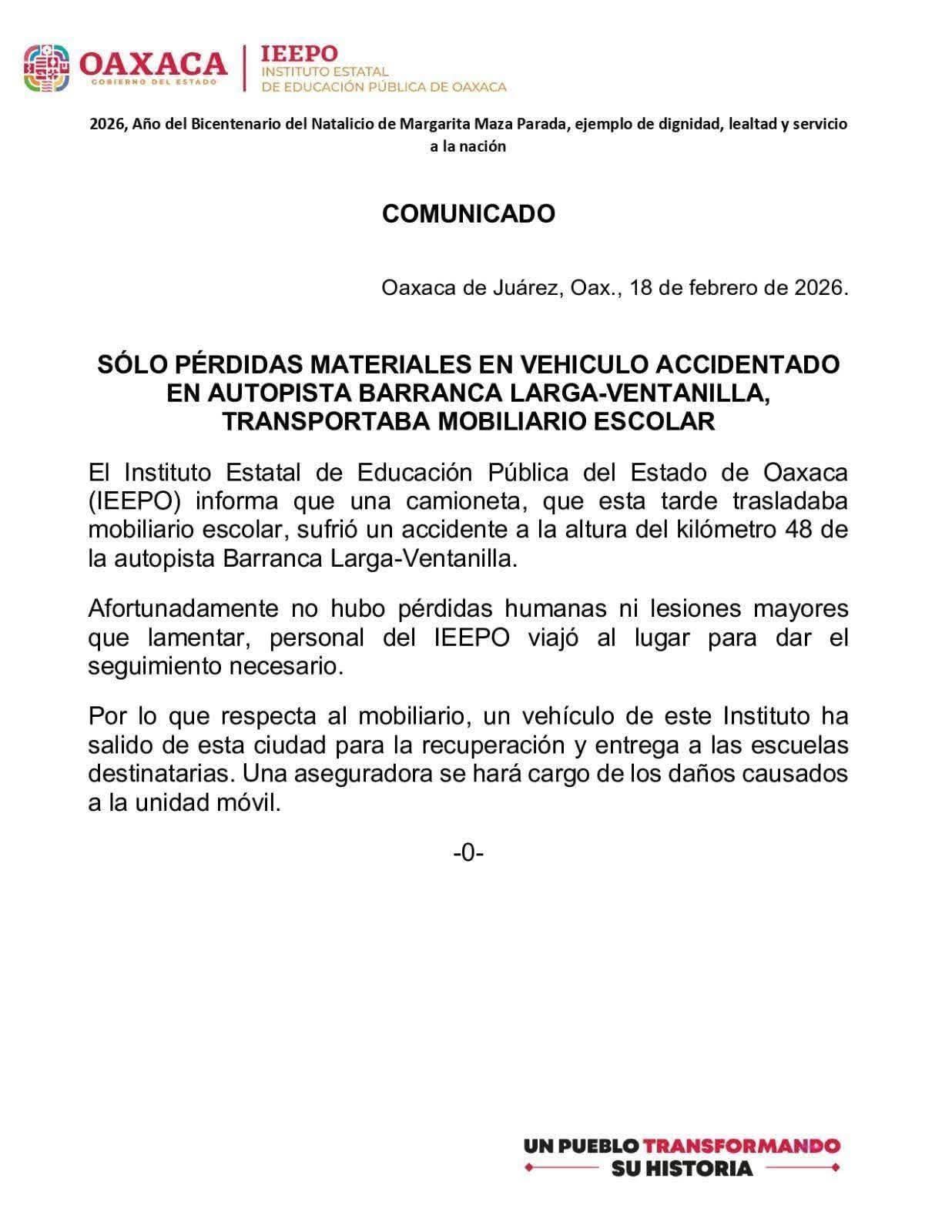 Oaxaca, Oax. 19 de febrero del 2026.-El Instituto Estatal de Educación Pública de Oaxaca (IEEPO) informó que un vehículo que transportaba mobiliario escolar rumbo a la costa , sufrió un accidente sobre la autopista Barranca Larga-Ventanilla, sin víctimas que lamentar y solo daños materiales.